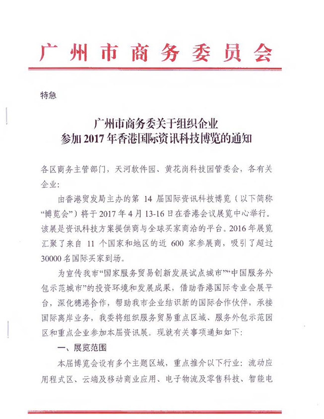 广州市商务委关于组织企业参加2017年香港国际资讯科技博览的通知