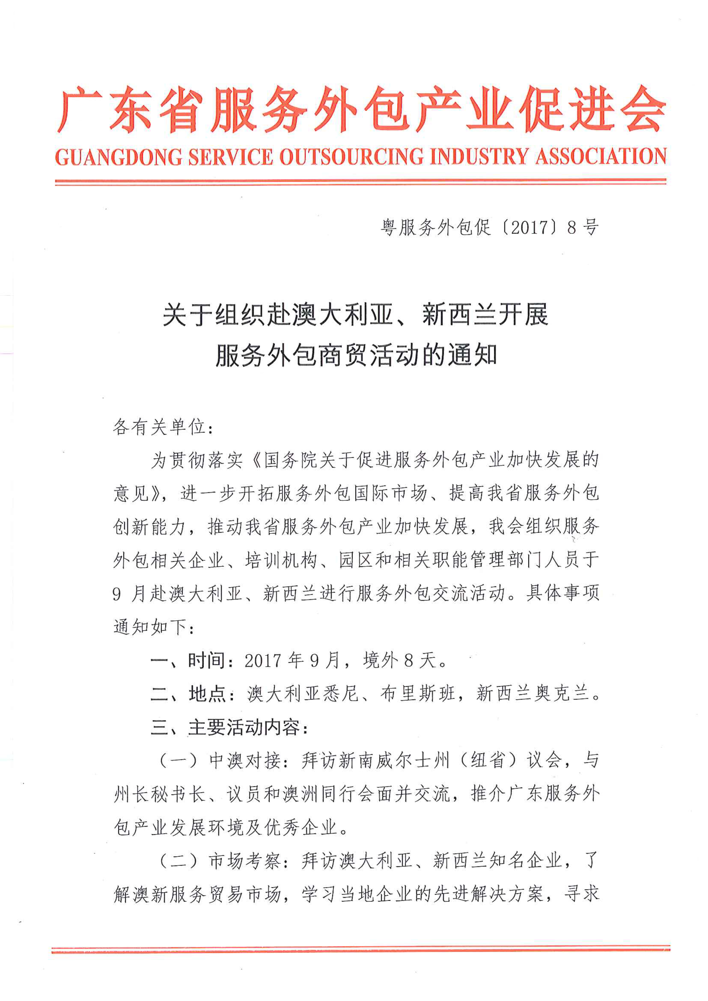 转发:关于组织赴澳大利亚、新西兰开展服务外包商贸活动的通知