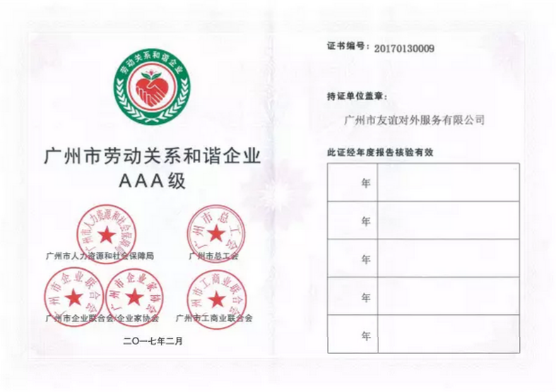 会员风采:友谊外服获得广州市劳动关系和谐企业AAA级称号