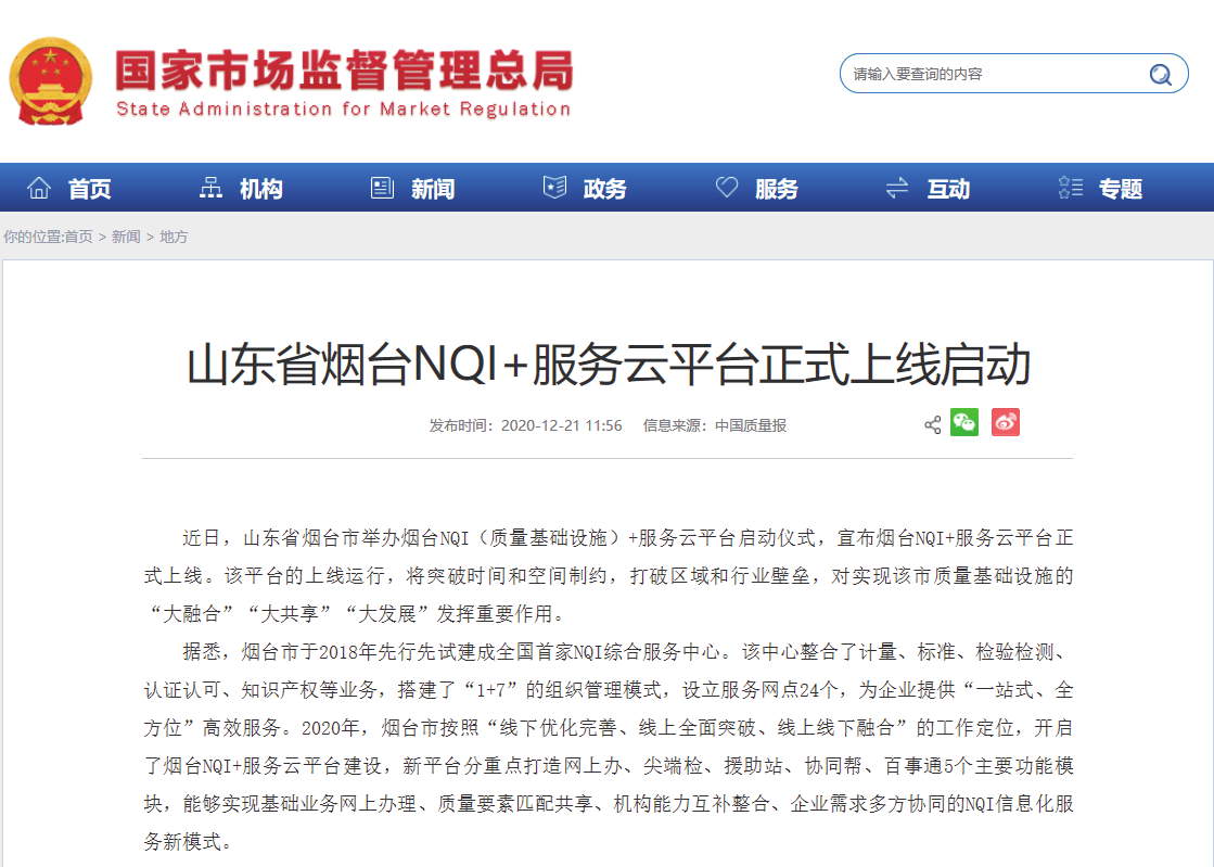 平台设立NQI网上办、NQI尖端检、NQI协同帮、NQI援助站、NQI百事通五大功能板块,服务于烟台市各类生产经营企业、科研院所、高校、第三方机构等单位,实现仪器设备共享、中小微企业扶持、多领域专家协同服务等质量服务新生态,是烟台市从NQI技术大市向NQI技术强市转变的关键一步。平台的运行受到社会各界的广泛关注,国家市场监管总局、质量新闻报、人民日报客户端、新浪、头条等媒体对平台进行了报道,山东省将平台作为国务院质量激励唯一推荐项目。