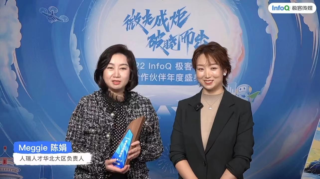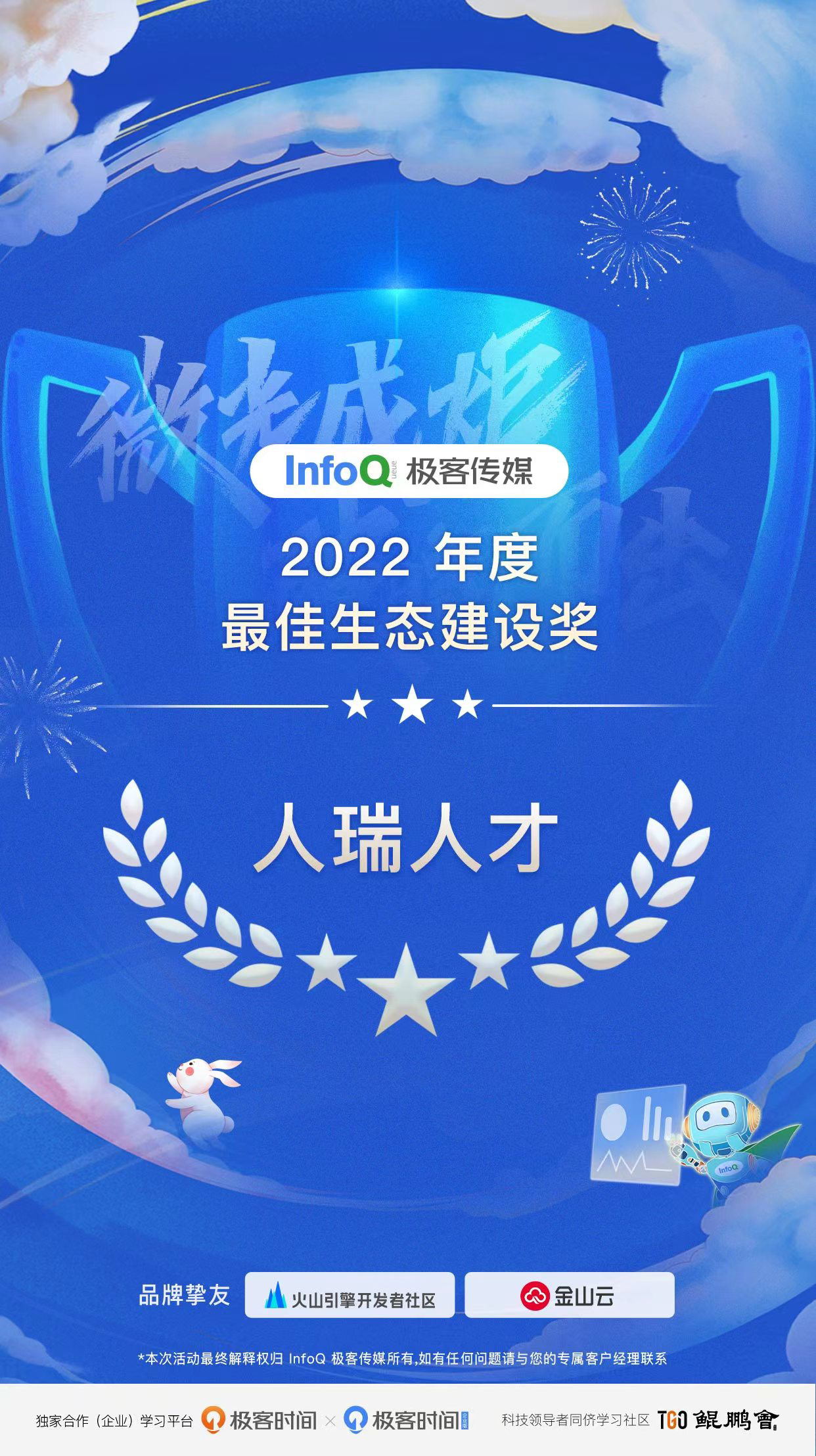 1月5日,在主题为“微光成炬·破晓而出“的2022 InfoQ极客传媒合伙伙伴年度盛典上,人瑞人才荣膺“2022年度最佳生态建设奖”。助力中国企业数字化转型升级是人瑞人才与极客传媒的共同愿景,由InfoQ极客传媒帮助企业大规模培养数字化人才,人瑞人才来帮助数字人才匹配到好的企业。