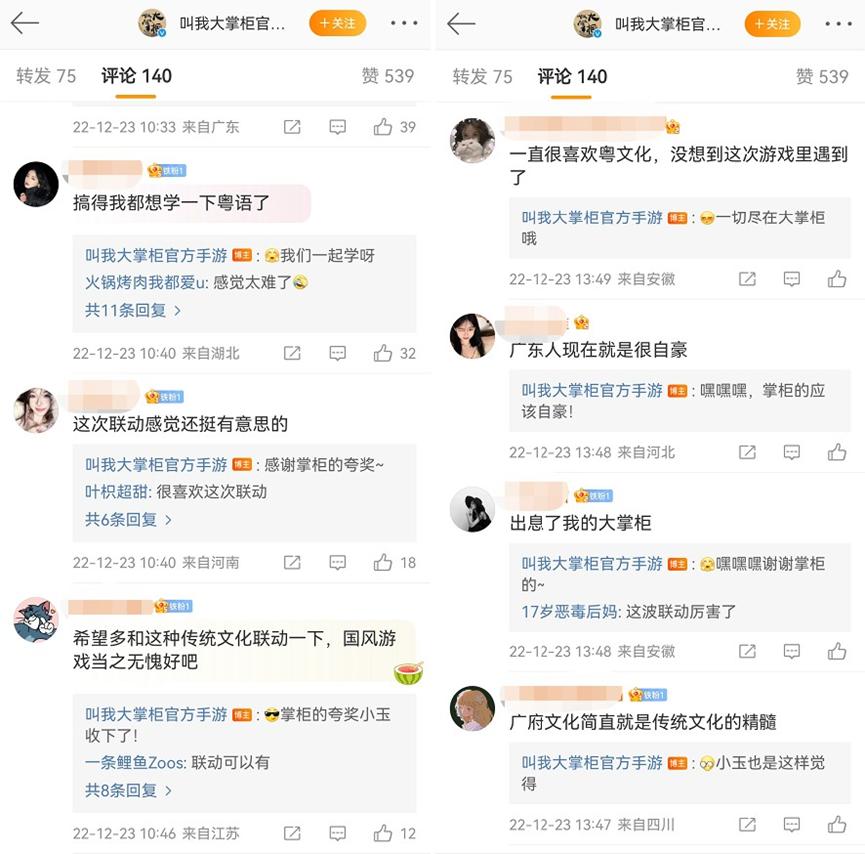 自“《叫我大掌柜》和广府文化探寻之旅”官宣以来,活动便获得广大网友一片赞许之声。上线后,微博话题阅读量立即突破10万。“这个活动真的很有意义”“搞得我都想学一下粤语”“神级联动,学到不少粤语知识”……在网络平台上,网友们纷纷表达了对于此次活动的喜爱,而网友们热情的反馈也体现出年轻一代对于这类文化创新性表现的肯定。