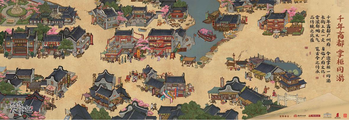 在此次联动中,五羊雕像、骑楼、醒狮、龙舟等广府特色街景被放置在《叫我大掌柜》北宋都城汴梁的街头各处,厚涂水墨的画风让它们别有一番韵味。在这里闲逛一圈,即可将广州原本遍布各处的经典景点一次性体验完全。“在街上,我们还设置了一些广府文化彩蛋,这些惊喜都等着用户自行探索发掘。”《叫我大掌柜》相关负责人介绍道。“我们希望用户在这里不仅可以看,还可以通过主动的参与,体验广府文化所带来的乐趣。”