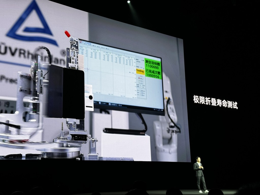 发布会现场, T?V莱茵技术专家在线展示了OPPO Find N3接受折叠测试的实测过程。现场嘉宾可以看到,该产品通过折叠无忧认证所有测试项后,仍在实验室中接受不间断折叠,截止发布会连线时刻已超过100 万次。这意味着OPPO Find N3的折叠屏经历长时间使用后,依然能保持良好的显示效果和操作性能,充分体现出产品自身的折叠可靠性。